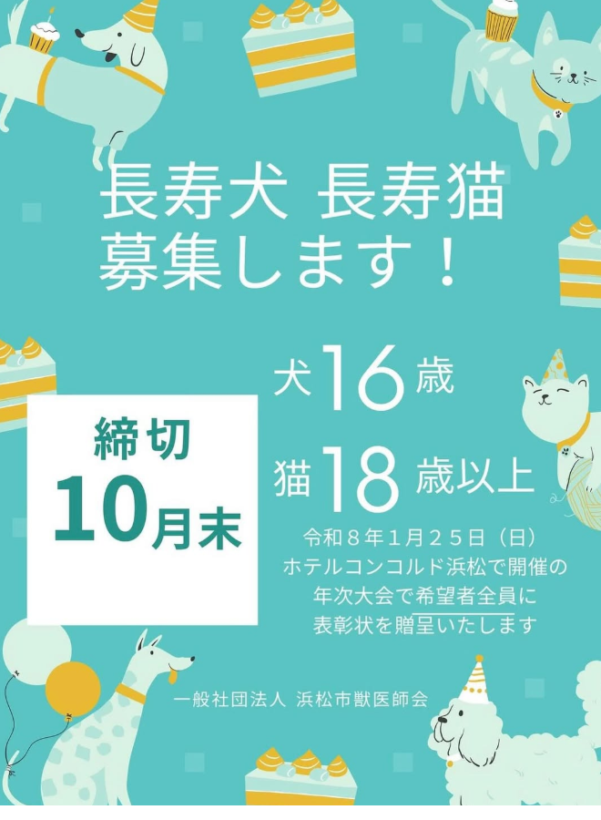 浜松市獣医師会年次大会でのご長寿表彰式に参加ご希望の方はスタッフへお声がけください。